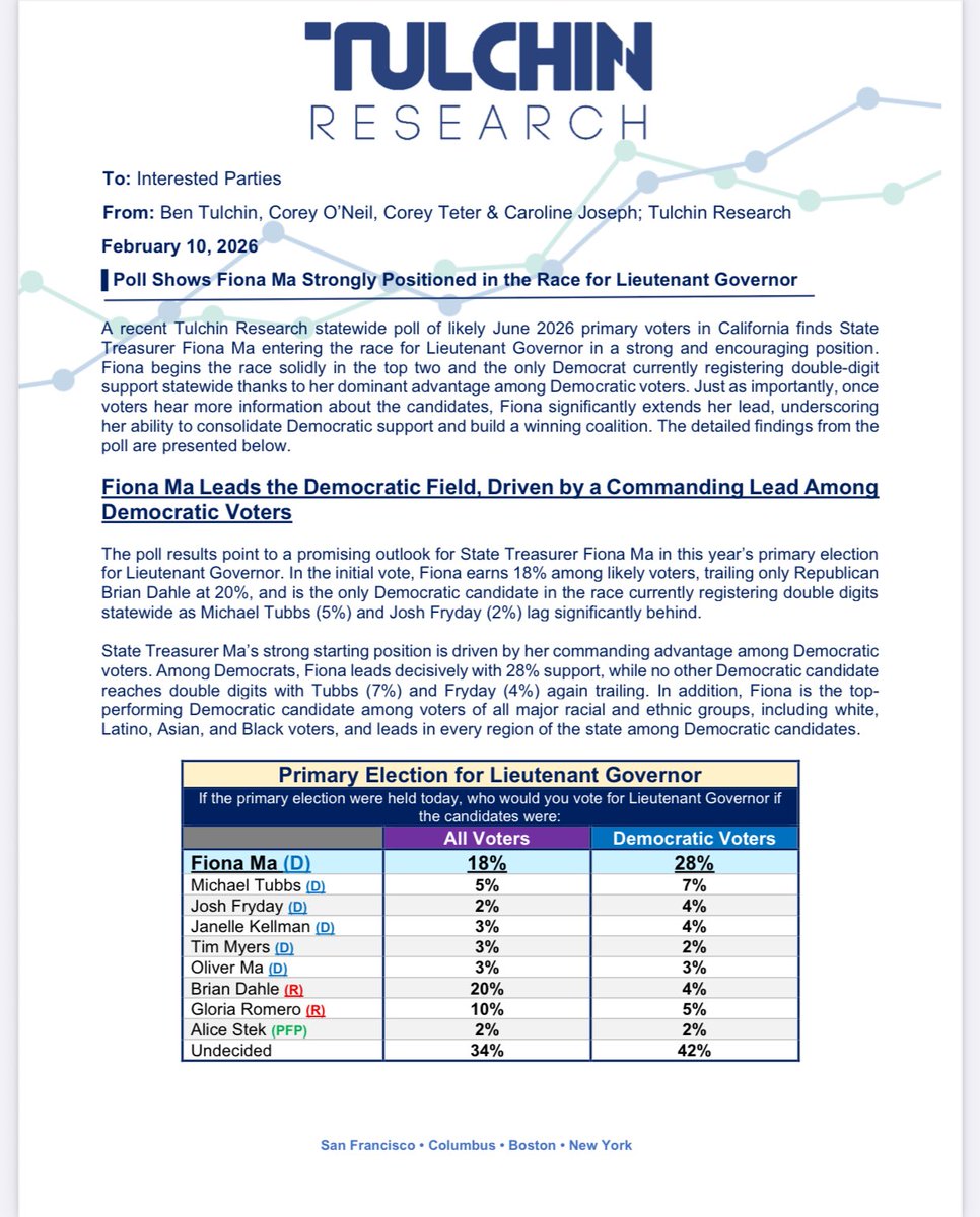 Ma has served as state treasurer since 2019 and announced her campaign for lieutenant governor in early June 2023. A recent poll by Tulchin Research shows the Democratic state treasurer in second place overall, with 18% support among likely statewide voters in the June primary.