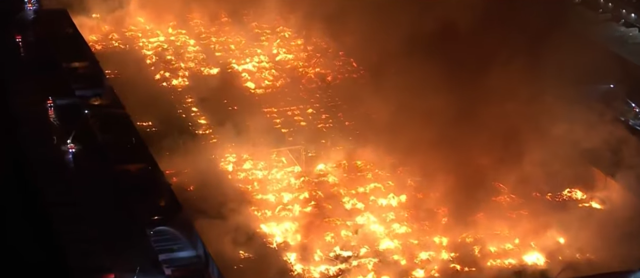 Emergency crews were dispatched around 12:30 a.m., according to KTLA, arriving to find flames already spreading rapidly across the roughly 1.2 million-square-foot structure.