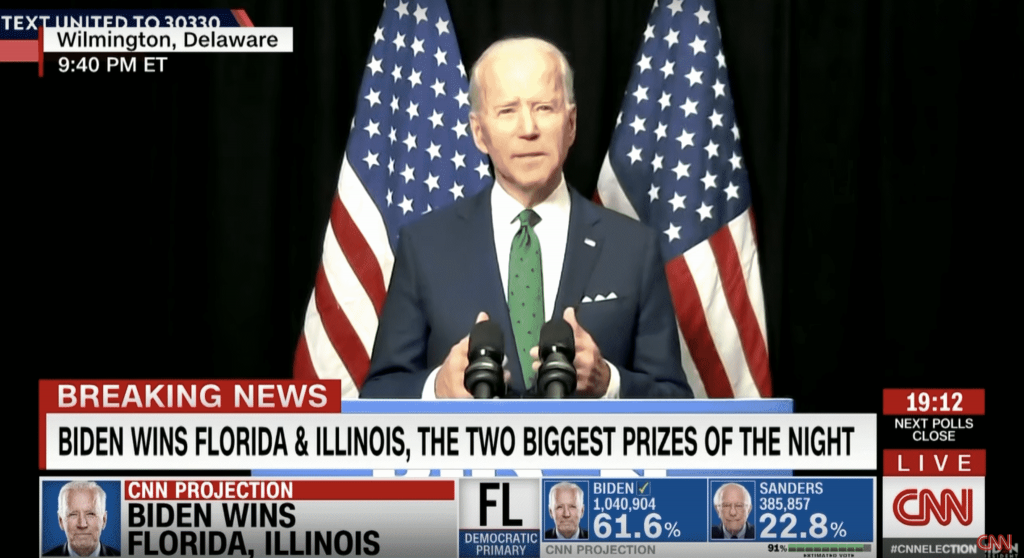 Biden won the primaries in Florida, Illinois, and Arizona. His total delegate count reaches 1,147. Sanders continues to fall behind with 861 delegates. The three primaries were held amid the coronavirus outbreak after the Ohio primary was postponed.
