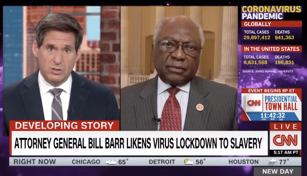 As AG Barr called a Covid-19 lockdown the “greatest intrusion on civil liberties” other than slavery, @WhipClyburn says “it is incredible” that Barr would “equate human bondage to expert advice to save lives. Slavery was not about saving lives, it was about devaluing lives” pic.twitter.com/ZUJe89YOiy