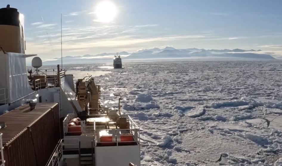 Footage shared by the Coast Guard shows the Polar Star crunching through dense sea ice to reach the stranded ship. The icebreaker made multiple close passes through the area, successfully breaking apart the frozen pack and loosening the grip on the cruise liner.