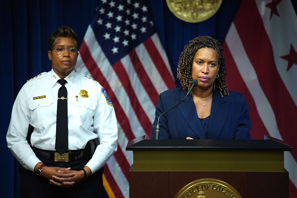 WASHINGTON, DC - AUGUST 11: Washington, DC Mayor Muriel Bowser (R), joined by Chief of Police at the Metropolitan Police Department Pamela Smith speaks at a press conference after President Donald Trump announced a federal takeover of the Metropolitan Police Department at the Wilson Building on August 11, 2025 in Washington, DC. President Trump announced he is placing the Department under federal control, and will deploy the National Guard to the District in order to assist in crime prevention in the nation’s capital. (Photo by Kevin Dietsch/Getty Images)