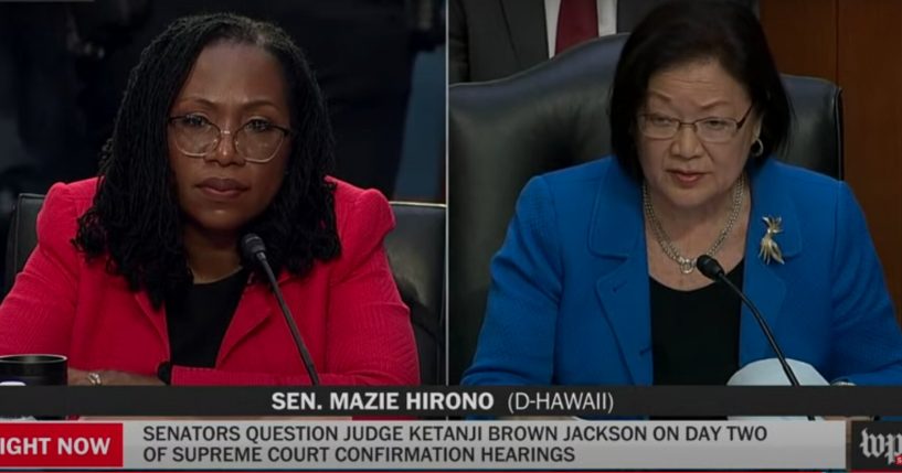 During Ketanji Brown Jackson’s confirmation hearing on Tuesday, Sen. Mazie Hirono (D-Hawaii) said, “As you may know, I ask the following two preliminary questions of every nominee who appears before any of the committees on which I sit. So I will ask you these two questions first.”