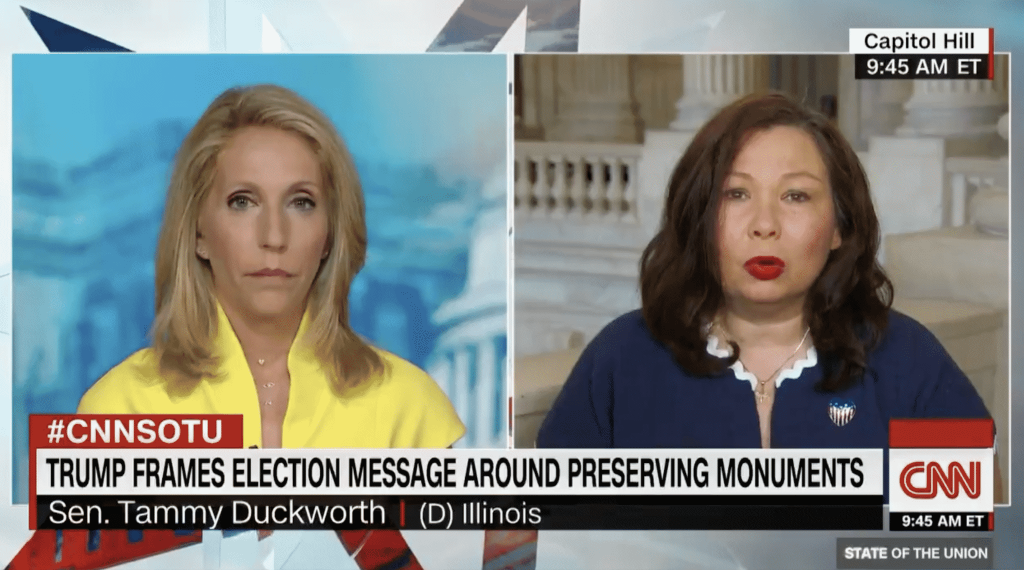 CNN’s Dana Bash, replayed a clip of Trump discussing the importance of preserving the nation’s historical monuments and asked Duckworth for her opinion on whether statues of those including George Washington should come down.