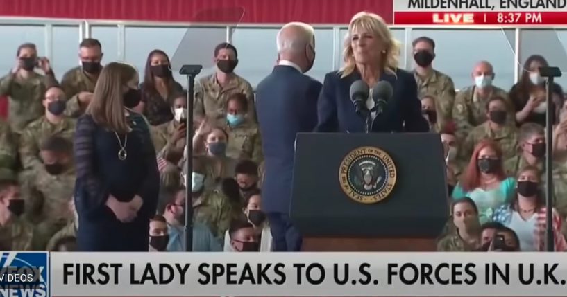 During a speech to American troops stationed in the U.K., first lady Jill Biden had to tell Joe to “pay attention” to her.
