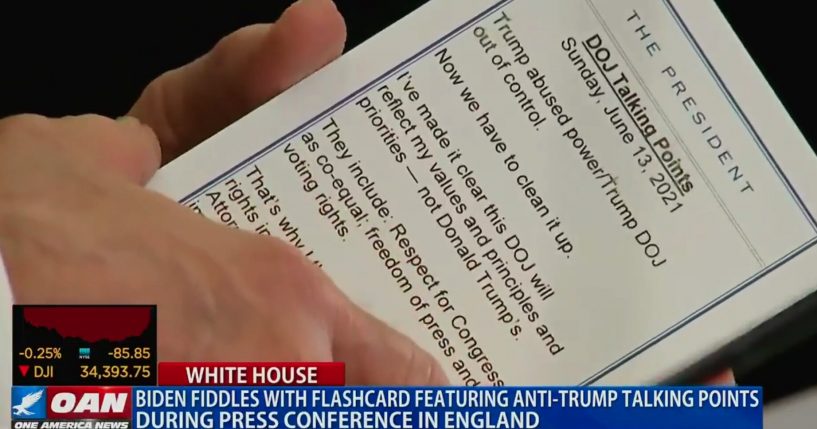 In a widely shared video from Biden’s news conference Sunday in Cornwall, the cards appear to show points he would have used if he were asked about how the Trump DOJ secretly obtained the phone records of House Democrats during a leak investigation. The matter is being investigated by the DOJ inspector general.
