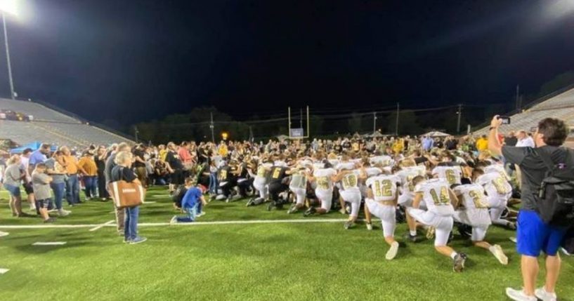 “Satan’s power was defeated tonight, as the threat of a legal action to forbid prayer after the game was overwhelmed by player lead prayer supported by parents and fans in solidarity on Overall Field,” he wrote.