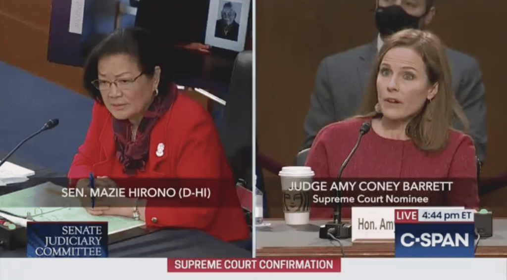 Sen. Mazie Hirono asks ACB "since you became a legal adult, have you ever made unwanted requests for sexual favors or committed any verbal or physical harassment or assault of a sexual nature?" pic.twitter.com/6JgLkoIXIF