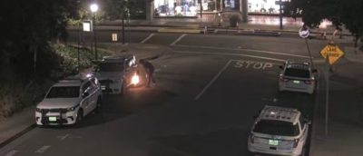 Goonan placed a bag of six incendiary devices called Molotov cocktails under a University of California Police Department (UCPD) patrol car near UC Berkeley’s campus on June 1, an incident caught on video, the DOJ said. On June 11, he threw rocks at a federal courthouse in the hope of throwing Molotov cocktails inside before federal agents stopped him. He then lit them ablaze at the side of the building.