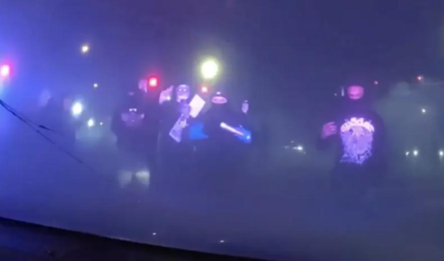 Dash camera footage captured individuals appearing to deliberately stand in the roadway to block police vehicles. Drivers continued performing dangerous stunts as the scene escalated.