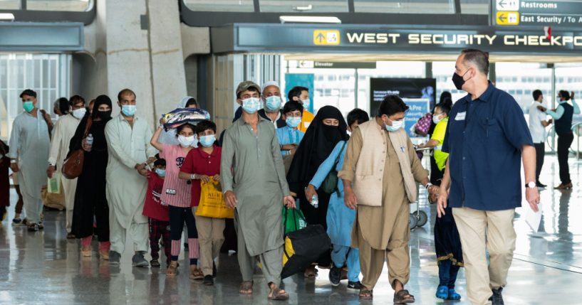 DULLES, VIRGINIA - AUGUST 31: Refugees walk through the departure terminal to a bus at Dulles International Airport after being evacuated from Kabul following the Taliban takeover of Afghanistan on August 31, 2021 in Dulles, Virginia. The Department of Defense announced yesterday that the U.S. military had completed its withdrawal from Afghanistan, ending 20 years of war. (Photo by Anna Moneymaker/Getty Images)