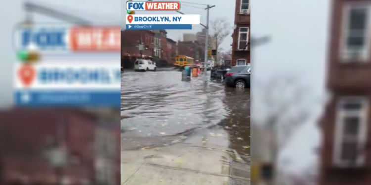 Some streets were flooding in Brooklyn, NY, Monday morning as a powerful storm made its way up the East Coast. #nywx pic.twitter.com/F4YiRy45Xa