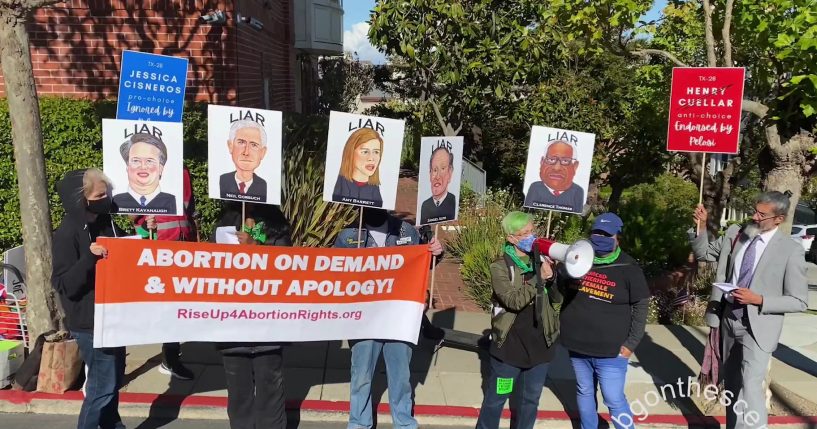 “We’re here because Nancy Pelosi and the whole leadership of the Democratic Party has been complicit, complicit with the fascist Republican Party that wants to not only eliminate abortion rights, but gay marriage, trans rights, and a whole slew of rights,” a protester shouted using a bullhorn.
