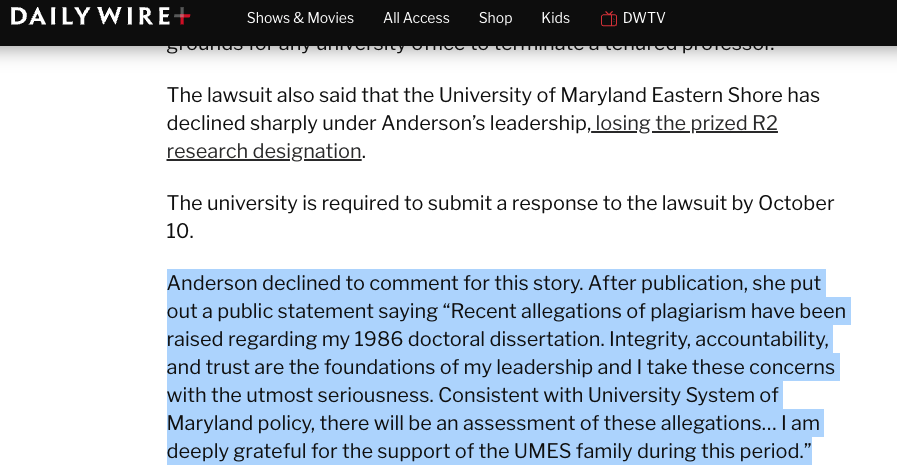 Representatives added that “the allegation by a disgruntled former employee that Dr. Anderson plagiarized her doctoral dissertation is incorrect.”