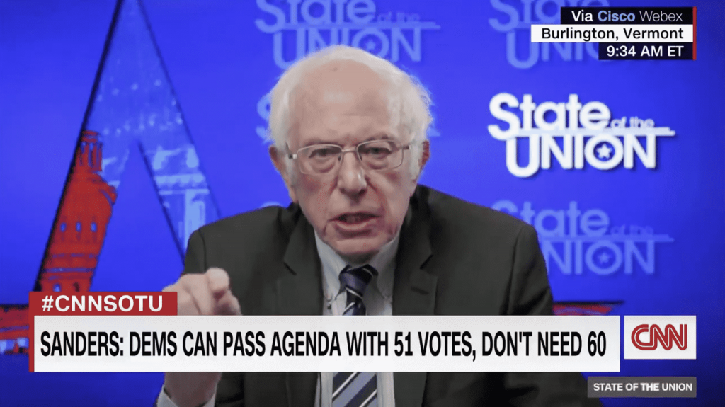 During an appearance on CNN’s “State of the Union” on Sunday, Sen. Bernie Sanders (I-Vt.) suggested that Democrats could bypass Republicans by using budget reconciliation — which only requires 51 votes — to pass the relief bill.