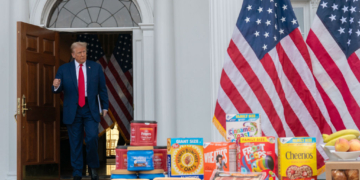 But Trump didn’t see the groceries until the end of his 45-minute talk when