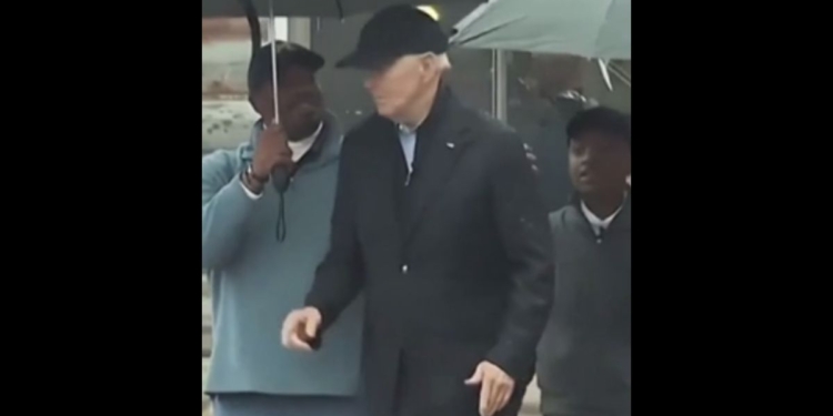 The video came from an event on Thursday at a Saginaw, Michigan, golf course where Biden stood in the rain before two “handlers” hurried to get him away from reporters, The Midwesterner News reported.