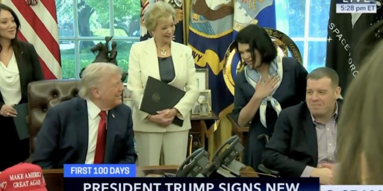 During an Oval Office visit with veterans Wednesday evening, President Donald Trump laughed at a “picture” depicting former President Joe Biden with a slogan next to it after pointing it out on one veteran’s prosthetic leg.