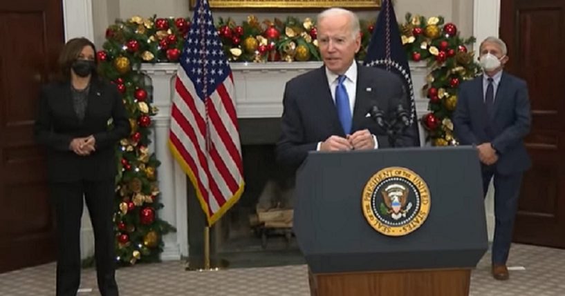 The event unfolded with Biden speaking from the podium, with Harris standing to his right and White House medical adviser Dr. Anthony Fauci at his left.
