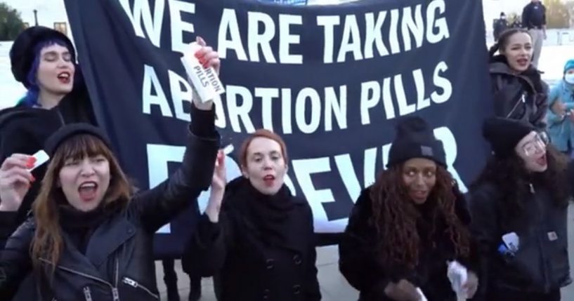 While demonstrating outside of the U.S. Supreme Court on Wednesday during opening arguments of a case that poses a direct challenge to the court’s Roe v. Wade decision legalizing abortion, a handful of female protestors were cheered on as they swallowed tablets that were purportedly abortion pills.